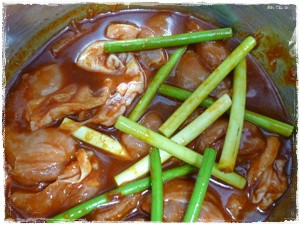 2・做醃料 醬油3大匙、味醂1大匙、酒1大匙、蜂蜜1大匙、韓式辣醬1大匙、蒜一片摩成末、麻油少許, 攪拌均勻之後 把雞肉放入醃料有時間的話最少醃30分鐘。