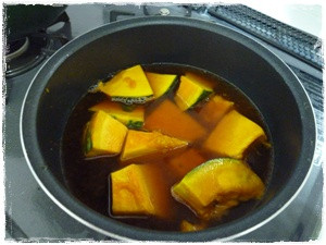 3.加入南瓜之後 蓋上「落とし蓋」 所謂落とし蓋在日本的煮物料理會使用得到,在煮汁上直接蓋落とし蓋可以讓煮汁不容易急速蒸發,讓熱循環比較好食材也不易煮爛。